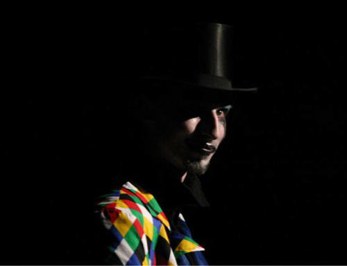 WEIß GESCHMINKTEM GESICHT, BUNT KARIERTEM FRACK UND